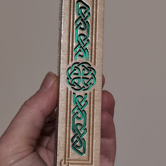 This elegant mezuzah is crafted with lightly stained baltic birch wood, featuring a Celtic knot to symbolize protection. The combination of cut outs and engraved lines adds texture and sophistication, and the luminous painted green background provides an eye catching contrast. Perfect as a wedding or bat mitzvah gift.